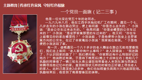 2021级电商1班的学生李思哲,则分享了他外公的亲身经历。他的外公叶士福同志曾先后被评为“五好战士”“先进工作者”和“优秀共产党员”等荣誉称号。2000年退休在家后,依旧保持着共产党员的本色,胸怀家国情怀、关心国家大事,尽己所能地发挥自身余热。从小的耳濡目染,李思哲也在外公的熏陶下,积极参与社会实践、公益活动,践行用知识服务社会、用行动承担责任,立志成为对社会有用的时代新人。无独有偶,2022级电商1班的吴浩楠同学的太奶奶也已光荣在党50年,始终不忘初心、牢记使命。吴浩楠说,太奶奶平日里总是教育他们一定要爱党爱国,有国才有家,只有中国共产党才能带领中国走向富强。他们牢记于心。