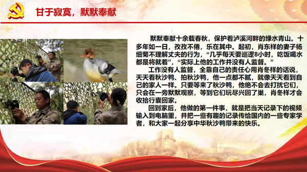 2021级大数据与会计三班的学生刘嘉琪,走访了鹰潭市龙虎山风景名胜区上清镇护林员、中华秋沙鸭保护员肖冬样,分享了他默默坚守的故事。18年来,肖冬样扎根深山,主动担起保护动物中华秋沙鸭的重任,详细记录中华秋沙鸭的来去时间、数量以及活动规律和生活习性,拍摄了20多万张照片、1万多G视频,形成了研究中华秋沙鸭的第一手珍贵资料,被称为中华秋沙鸭的“保护神”。他用自己的实际行动,践行一个基层共产党员的职责,在平凡的岗位上做出了不平凡的事迹。
