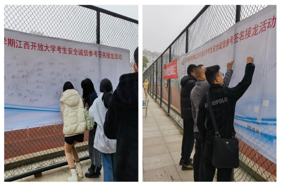 3月4日至5日,2022年秋季学期开放教育期末纸质考试进行。开考前,继续教育学院在西湖校区考点组织近千名开放教育考生进行安全诚信参考签名接龙活动。活动现场,同学们在条幅上认真签下自己的姓名,表达了自己安全诚信考试的决心。大家纷纷表示会严格遵守考试纪律和考场秩序,积极践行安全诚信考试承诺。