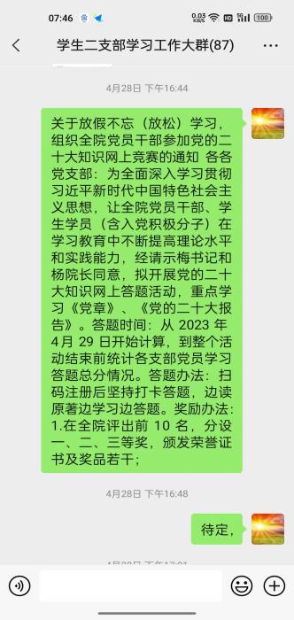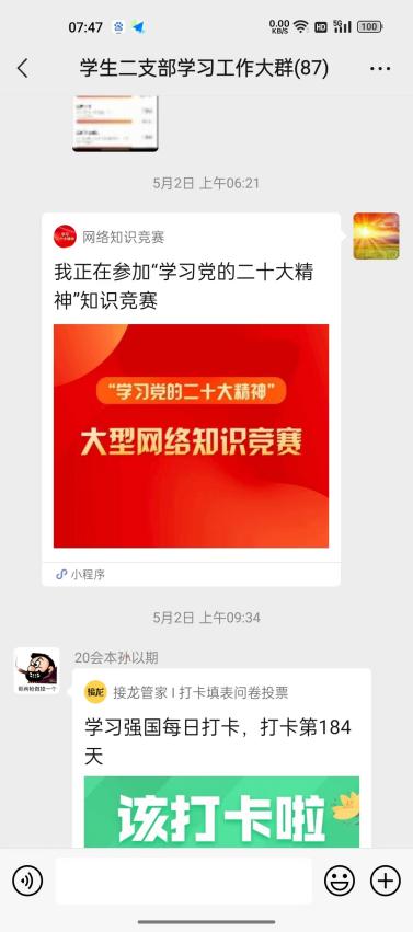 压实责任,带头读书学习。学生二支部结合自身实际,提早研究、深入思考,细化主题教育工作安排,班子带头突出问题导向,普通党员主动认领问题与整改责任,深入开展党性分析,统筹谋划部署,画好“施工图”。支部先后召开支委会、党员大会, 部署安排主题教育工作,深化对主题教育重要意义的认识,对理论学习、调查研究、检视整改等环节作出详细安排,明确“任务书”。构建知识竞赛促进学、周四集中专题学、心得交流研讨学、个人研读思考学“四学”体系,确保师生党员上好“理论课”。
