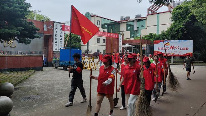 师生同行,共建美丽校园。23日下午,学院党委书记梅甜甜、院长杨柳和二支部近百名师生,身着红马甲、头戴志愿小红帽,有的出臂扫除将散布的落叶杂物扫成小堆,有的弯腰挥铲将聚成小堆的杂物落叶装入垃圾桶,大家边劳动、边交谈,原本随处可见的白色垃圾、一尺来长杂草丛生的拥军路,在细雨微风下恢复了沥青黑,变得整齐干净。师生同劳动,问需于生,了解基层所思所想所盼,从思想感情上接近师生,为科学施策提供准确的现实依据。