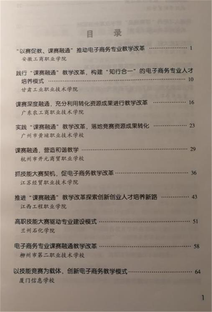 近日,由全国电子商务运营竞赛委员会编写《电子商务“课赛融通”职业教育教学改革研究与实践》一书正式发布,该案例集的出版标志着“课赛融通”在机制、内容、方式上进入成熟阶段,书中共收录全国15家在“课赛融通”教学改革上取得标志性成果的中高职院校典型案例,其中高职10家,中职5家。江西工程职业学院电子商务专业阶段性教学改革成果及经验,被以《推进“课赛融通”教学改革 探索创业创业人才培养新路》为题收录其中。