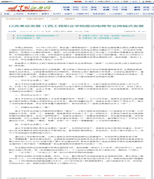 3月8日,大江网以《以改革促发展 江西工程职业学院推动电商专业跨越式发展》为标题,聚焦我院电子商务专业5年以来的发展变化。
