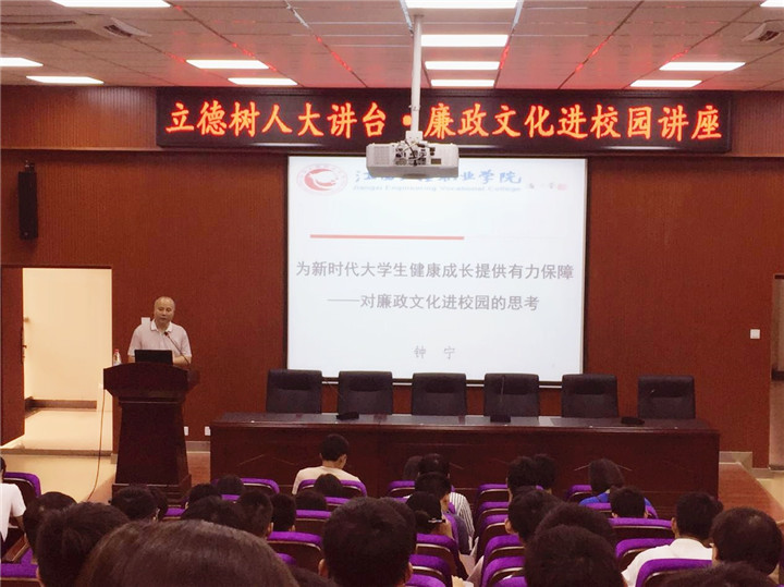为全面贯彻习近平新时代中国特色社会主义思想和党的十九大精神,让廉政文化教育深入人心,培育浓郁的崇廉尚洁校园文化氛围。5月17日下午,在多功能厅举办了“立德树人大讲台·廉政文化进校园”专题教育讲座。学院纪委书记钟宁做了题为《为新时代大学生健康成长提供有力保障——对廉政文化进校园的思考》讲座。讲座由学院纪委办主任、监察审计处处长郑金胜主持。团委书记洪莉、学生工作处和团委的相关老师及120余名学生参加了此次讲座。
