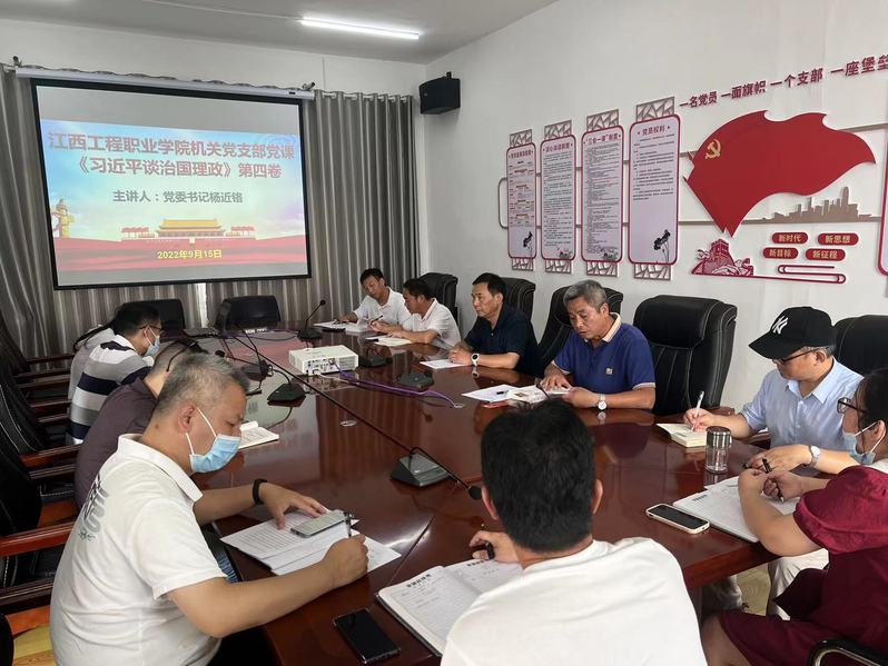 2022年9月15日,党委书记杨近铬在学院机关党支部上党课,谈《习近平谈治国理政》第四卷学习的路径和态度,分享学习的心得和体会,并要求全体党员同志要持续在学懂、弄通、做实上下功夫,坚决贯彻落实到教育教学工作的全过程、各方面。这次党课有深度,有热度,有广度,助力机关支部掀起学习《习近平谈治国理政》第四卷的热潮。机关党支部全体党员聆听了杨书记的报告。